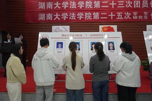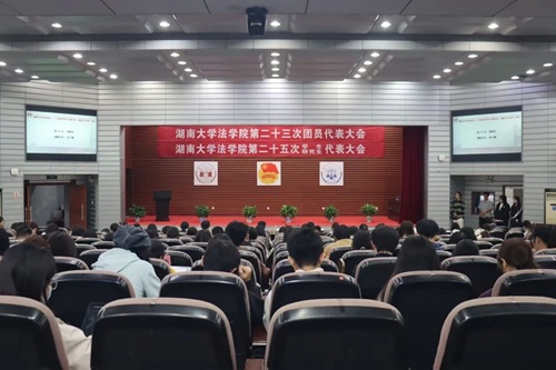 2025年11月8日,湖南大學法學院第二十三次團員代表大會在法學院報告廳隆重召開。法學院黨委書記李勁松老師,共青團湖南大學委員會副書記鄒昶老師,法學院黨委副書記、紀委書記胡瓊老師,法學院團委書記、本科生輔導員曹曉軍老師,本研共計140名團員代表參加會議。