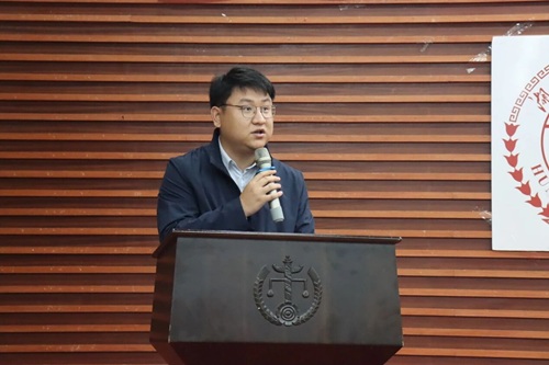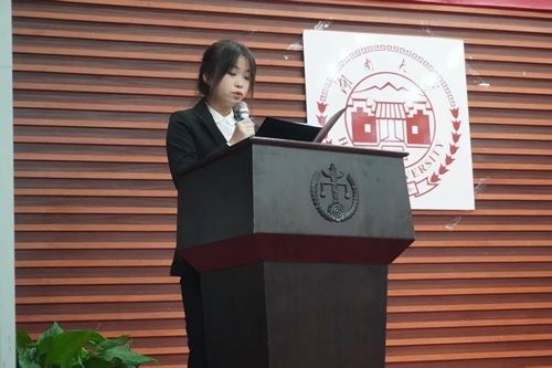 接下來,鄒昶老師為大會致辭。他肯定了法學院團委工作在思想能力、組織建設、學術(shù)創(chuàng)新、校園、文化、社會實踐、志愿服務等多個方面做出的大量卓有成效的工作。他指出,當今時代為青年實現(xiàn)夢想提供了廣闊平臺,同時也對共青團工作提出了更高要求。借此機會,他對新一屆的法學院團委提出期望:第一、對黨忠誠,強化思想政治能力,將個人理想融入黨和國家事業(yè);第二、持續(xù)打造具有法學學科特色的活動,提升學生綜合素質(zhì),引導學生成為擔當重任的棟梁之才;第三、勇于改革創(chuàng)新,夯實基層組織基礎,持續(xù)深化共青團改革,增強政治性,先進性和群眾性;第四、凝聚力量,服務學校和學院發(fā)展,為建設法治社會,弘揚公平正義貢獻智慧和力量。