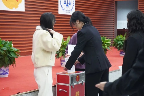隨后,大會舉行換屆選舉。代表們秉持公平、公正、公開原則,依次投下莊嚴一票。總監(jiān)票人、監(jiān)票人全程監(jiān)督,總計票人、計票人當場啟封、清點、唱票并統(tǒng)計。最終,法學院第二十二屆團委委員張騁向大會報告法學院第二十三屆團委選舉結(jié)果:青年教師曹曉軍,研究生蘇彥銘,本科生任一鳴等同學當選為新一屆團委委員。