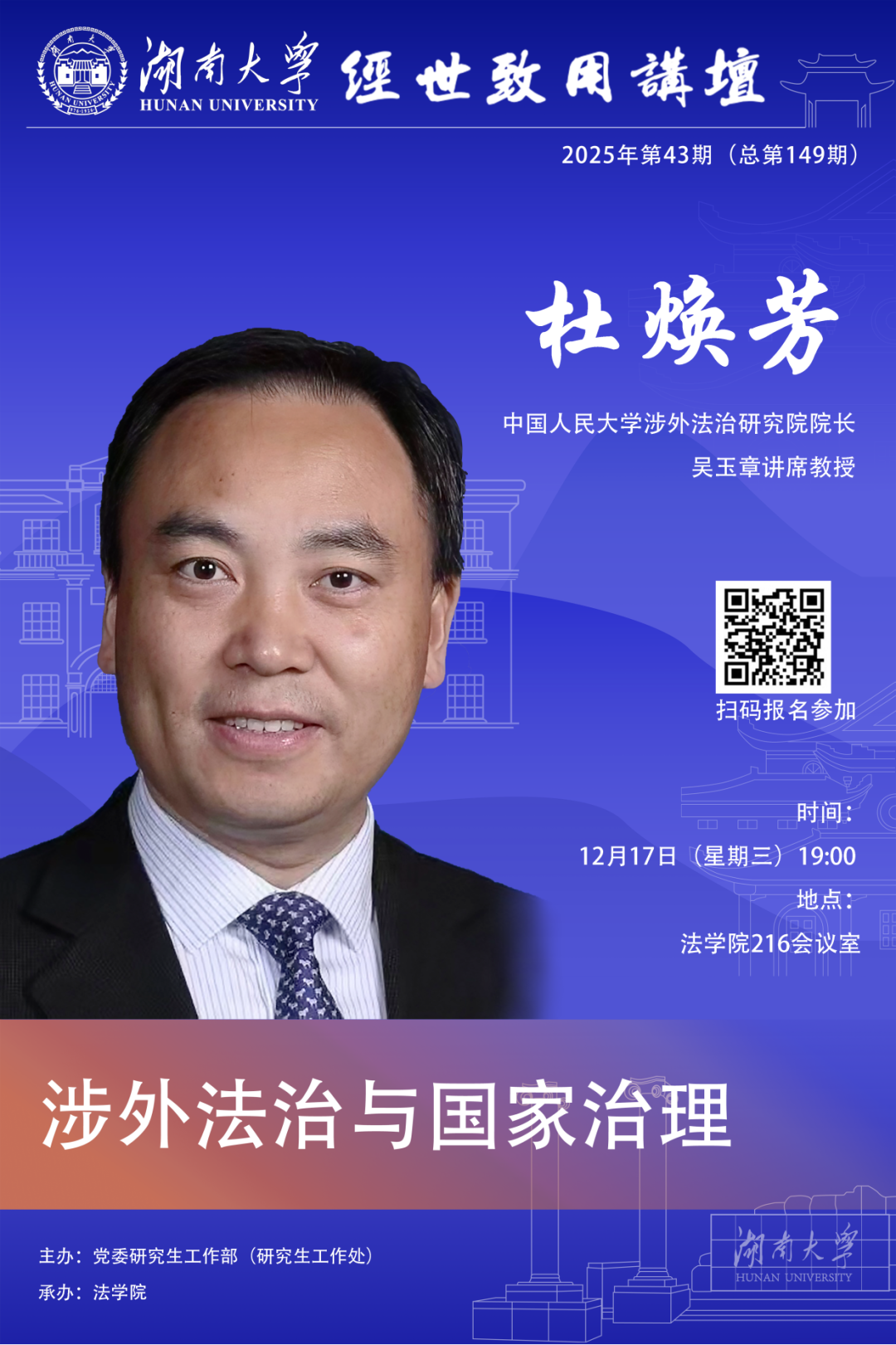 12月17日19:00邀請中國人民大學涉外法治研究院院長、吳玉章講席教授杜煥芳于法學院216會議室作“涉外法治與國家治理”主題講座,歡迎同學們踴躍參加。
