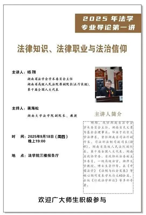 2025年9月18日晚,現(xiàn)任湖南省法學會學術委員會主任、湖南省見義勇為基金會理事長楊翔教授在湖南大學法學院報告廳,為2025級新生帶來主題為“法律知識、法律職業(yè)與法治信仰”的法學專業(yè)導論第一講。楊翔教授畢業(yè)于北京大學法律系,曾任湖南省司法廳副廳長、司法部法制司副司長(掛職)、湖南省高級人民法院副院長、第十屆全國人大代表、湖南省政協(xié)常委、省政協(xié)社法委副主任委員,一級高級法官,湘潭大學教授、博士生導師等。在《中國法學》《法制與社會發(fā)展》等核心期刊發(fā)表學術論文40余篇,出版《行政法學新論》等多部專著。本次入學導論由法學院副院長蔣海松老師主持,法學院本科新生到場聆聽,現(xiàn)場氣氛熱烈。